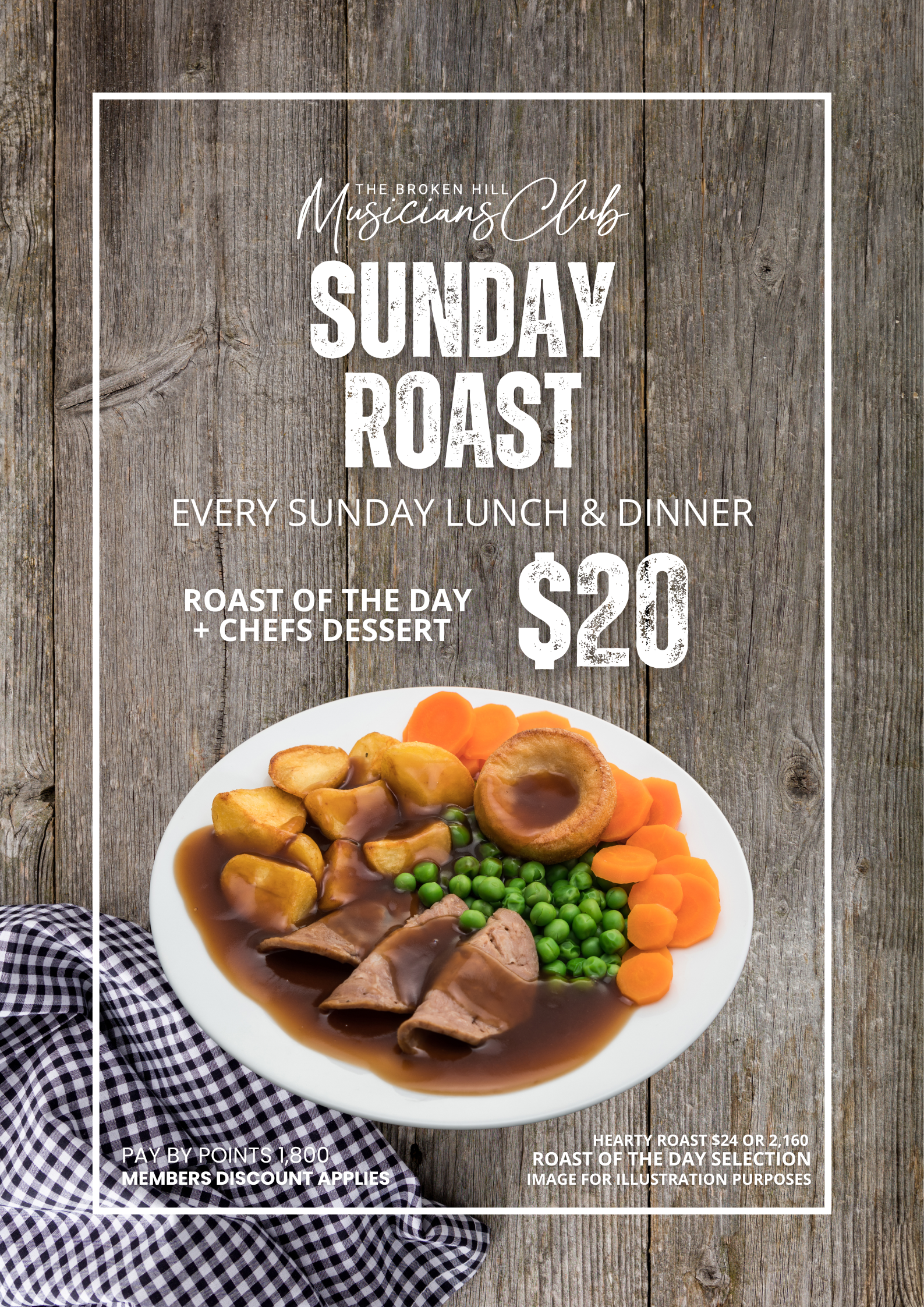 Sunday Roast. 2 Courses (Main & Dessert) From $20 per person.
